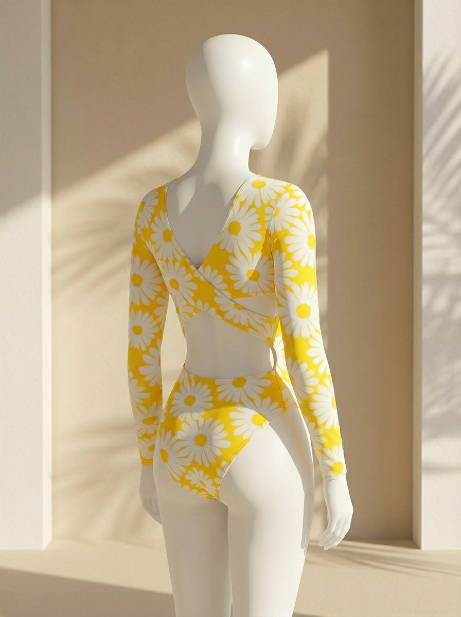 Traje de baño amarillo estampado con mangas largas, espalda cruzada